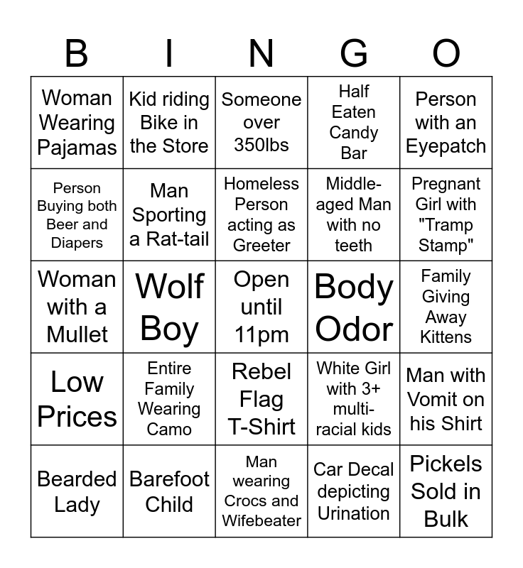 This bingo card has a free space and 24 words: Entire Family Wearing Camo, Barefoot Child, Homeless Person acting as Greeter, Bearded Lady, Person with an Eyepatch, Woman Wearing Pajamas, Person Buying both Beer and Diapers, Kid riding Bike in the Store, Body Odor, Rebel Flag T-Shirt, Middle-aged Man with no teeth, Woman with a Mullet, White Girl with 3+ multi-racial kids, Man with Vomit on his Shirt, Man Sporting a Rat-tail, Car Decal depicting Urination, Family Giving Away Kittens, Someone over 350lbs, Pregnant Girl with "Tramp Stamp", Wolf Boy, Pickels Sold in Bulk, Low Prices, Half Eaten Candy Bar and Man wearing Crocs and Wifebeater.