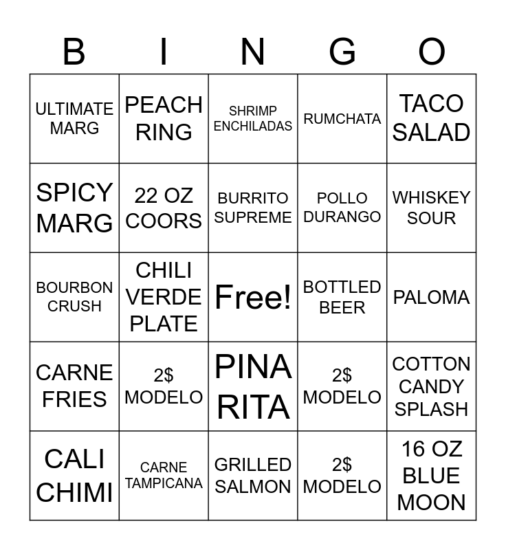 This bingo card has a free space and 24 words: 2$ MODELO, CARNE TAMPICANA, BURRITO SUPREME, CALI CHIMI, TACO SALAD, ULTIMATE MARG, SPICY MARG, PEACH RING, BOTTLED BEER, PINA RITA, POLLO DURANGO, BOURBON CRUSH, 2$ MODELO, COTTON CANDY SPLASH, 22 OZ COORS, 2$ MODELO, PALOMA, SHRIMP ENCHILADAS, WHISKEY SOUR, CHILI VERDE PLATE, 16 OZ BLUE MOON, CARNE FRIES, RUMCHATA and GRILLED SALMON.