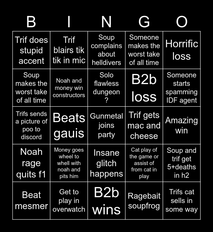 This bingo card has a free space and 24 words: Money goes wheel to whell with noah and pits him, Get to play in overwatch, Solo flawless dungeon ?, Beat mesmer, Horrific loss, Trif does stupid accent, Soup makes the worst take of all time, Trif blairs tik tik in mic, Trif gets mac and cheese, Insane glitch happens, B2b loss, Trifs sends a picture of poo to discord, Cat play of the game or assist of from cat in play, Soup and trif get 5+deaths in h2, Noah and money win constructors, Ragebait soupfrog, Amazing win, Soup complains about helldivers, Someone starts spamming IDF agent, Beats gauis, Trifs cat sells in some way, Noah rage quits f1, Someone makes the worst take of all time and B2b wins.