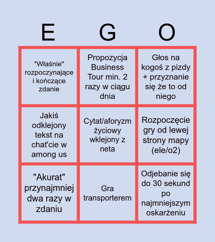 This bingo card has a free space and 8 words: Rozpoczęcie gry od lewej strony mapy (ele/o2), Głos na kogoś z pizdy + przyznanie się że to od niego, Propozycja Business Tour min. 2 razy w ciągu dnia, "Akurat" przynajmniej dwa razy w zdaniu, "Właśnie" rozpoczynające i kończące zdanie, Odjebanie się do 30 sekund po najmniejszym oskarżeniu, Jakiś odklejony tekst na chat'cie w among us and Gra transporterem.