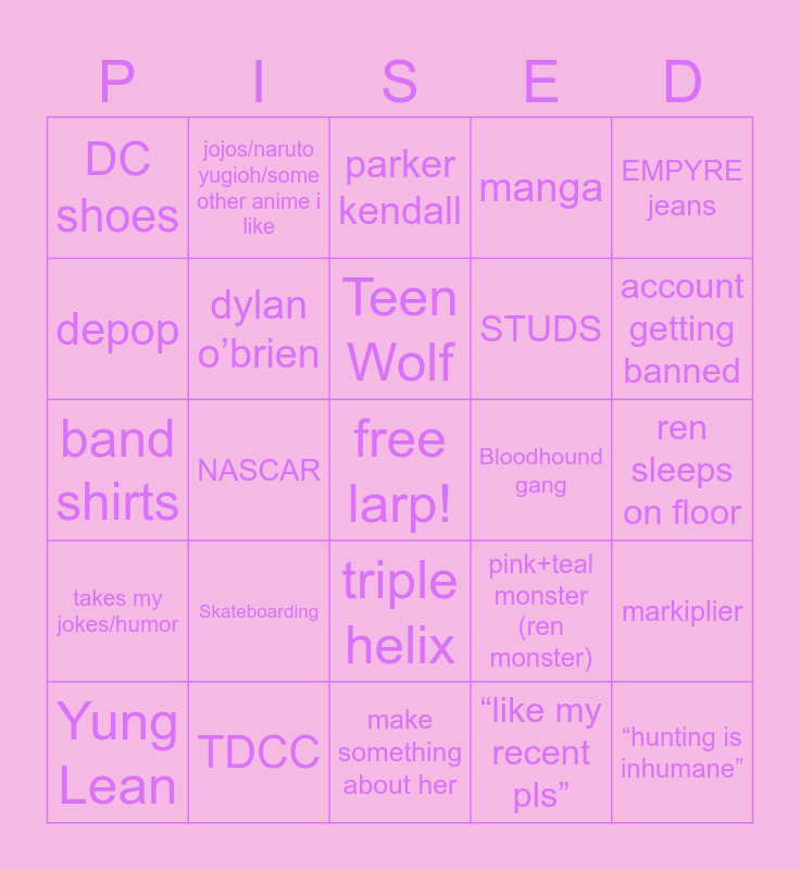 This bingo card has a free space and 24 words: Skateboarding, TDCC, Teen Wolf, Yung Lean, EMPYRE jeans, DC shoes, depop, jojos/naruto yugioh/some other anime i like, Bloodhound gang, triple helix, STUDS, band shirts, pink+teal monster (ren monster), markiplier, dylan o’brien, “like my recent pls”, ren sleeps on floor, parker kendall, account getting banned, NASCAR, “hunting is inhumane”, takes my jokes/humor, manga and make something about her.