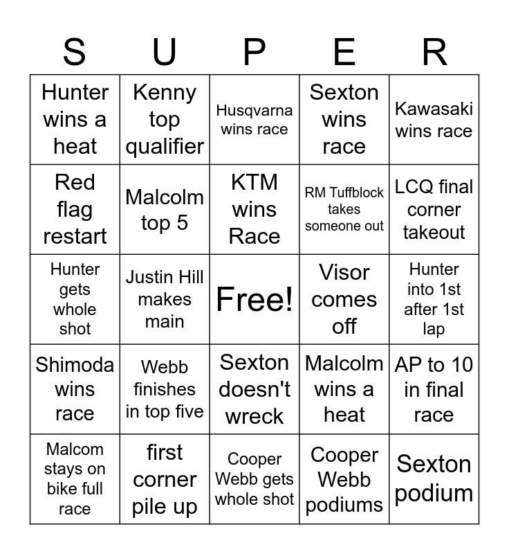 This bingo card has a free space and 34 words: Anderson down in first corner, Joe S podiums, Nate Thrasher cuts down, Tomac podiums, Hunter into 1st after 1st lap, Red flag restart, Malcolm top 5, Cooper Webb gets whole shot, RM Tuffblock takes someone out, Sexton podium, Hunter gets whole shot, Kenny top qualifier, Cooper Webb podiums, Tomac wins race, Shimoda wins race, Justin Hill makes main, Sexton doesn't wreck, Visor comes off, AP to 10 in final race, Malcom stays on bike full race, first corner pile up, Privateer gets holeshot, Sexton wins race, LCQ final corner takeout, Anderson taken out, Webb finishes in top five, Husqvarna wins race, Honda wins Race, Kawasaki wins race, Hunter wins a heat, Anderson wins a heat, KTM wins Race, Malcolm wins a heat and Justin Hill top 10.