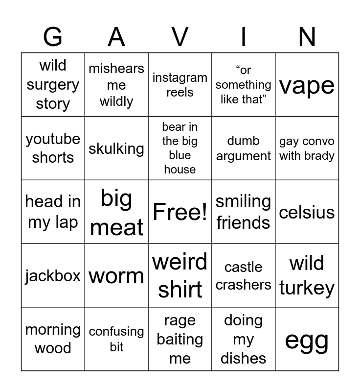 This bingo card has a free space and 24 words: worm, confusing bit, bear in the big blue house, morning wood, vape, wild surgery story, youtube shorts, mishears me wildly, smiling friends, weird shirt, dumb argument, head in my lap, castle crashers, wild turkey, skulking, doing my dishes, celsius, instagram reels, gay convo with brady, big meat, egg, jackbox, “or something like that” and rage baiting me.