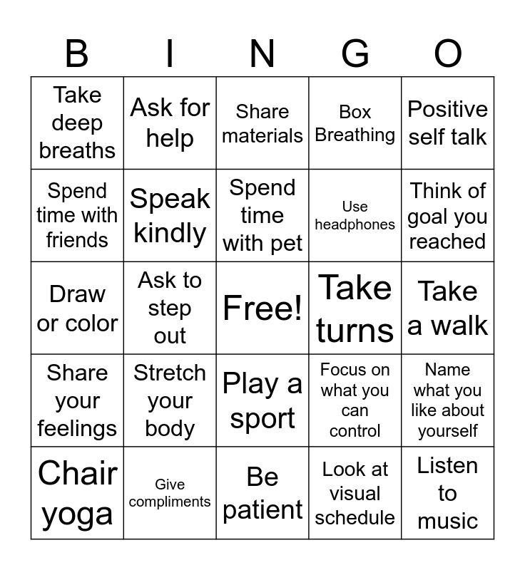 This bingo card has a free space and 24 words: Stretch your body, Give compliments, Spend time with pet, Chair yoga, Positive self talk, Take deep breaths, Spend time with friends, Ask for help, Take turns, Play a sport, Use headphones, Draw or color, Focus on what you can control, Name what you like about yourself, Speak kindly, Look at visual schedule, Take a walk, Share materials, Think of goal you reached, Ask to step out, Listen to music, Share your feelings, Box Breathing and Be patient.
