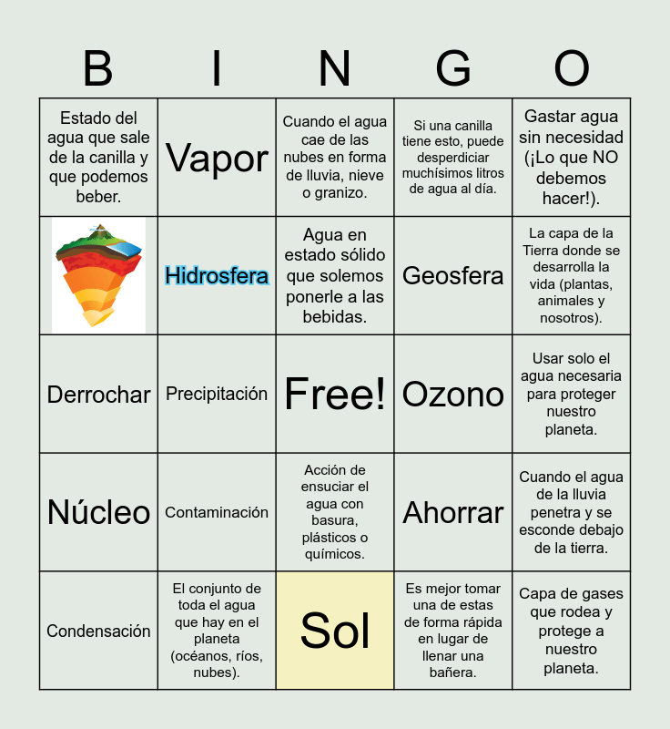 This bingo card has 2 images, a free space and 47 words: Biosfera, Capa de gases que rodea y protege a nuestro planeta., El paso donde el vapor se enfría en el cielo y forma las nubes., Sol, Contaminación, El centro de la Tierra, la parte más profunda y caliente de todas., Vapor, Manto, Así se le llama al agua que es segura, limpia y lista para que la bebamos., Hidrosfera, Si una canilla tiene esto, puede desperdiciar muchísimos litros de agua al día., Cuando el agua de la lluvia penetra y se esconde debajo de la tierra., Ahorrar, Nubes, El gas más importante de la atmósfera que necesitamos para respirar., Agua en estado sólido que solemos ponerle a las bebidas., Ozono, Debemos cerrarlo siempre mientras nos cepillamos los dientes., Gastar agua sin necesidad (¡Lo que NO debemos hacer!)., Precipitación, Es mejor tomar una de estas de forma rápida en lugar de llenar una bañera., Estado del agua que sale de la canilla y que podemos beber., Geosfera, Atmósfera, La capa de la Tierra donde se desarrolla la vida (plantas, animales y nosotros)., Condensación, El motor gigante de energía que hace funcionar todo el ciclo del agua., Acción de ensuciar el agua con basura, plásticos o químicos., Núcleo, Agua en estado gaseoso que sale de una olla hirviendo., La capa intermedia de la Tierra, que está muy caliente y se encuentra debajo de la corteza., Corteza, Potable, El conjunto de toda el agua que hay en el planeta (océanos, ríos, nubes)., Gotera, Infiltración, Usar solo el agua necesaria para proteger nuestro planeta., Están formadas por millones de gotitas de agua suspendidas en el cielo., Oxígeno, Hielo, La capa de la atmósfera que nos funciona como escudo contra los rayos peligrosos del Sol., Grifo (o Canilla), Derrochar, Cuando el agua cae de las nubes en forma de lluvia, nieve o granizo., Ducha, Líquido and La parte sólida de la Tierra, formada por rocas, minerales y suelos..