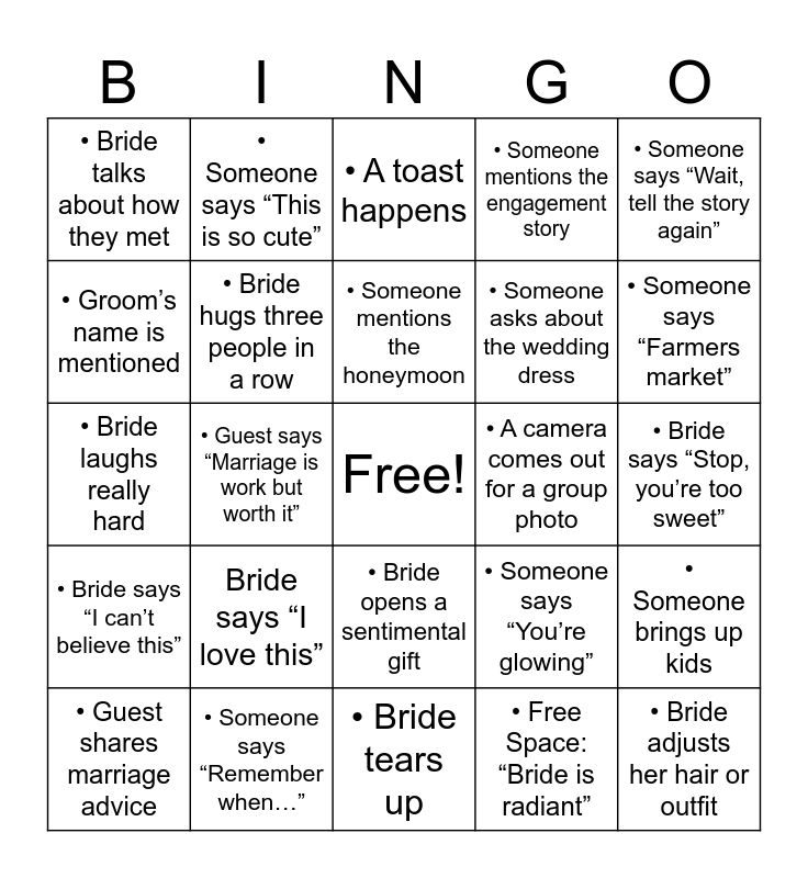 This bingo card has a free space and 25 words: Bride says “I love this”, • Bride tears up, • Someone mentions the honeymoon, • Guest shares marriage advice, • Someone says “Wait, tell the story again”, • Bride talks about how they met, • Groom’s name is mentioned, • Someone says “This is so cute”, • A camera comes out for a group photo, • Bride opens a sentimental gift, • Someone asks about the wedding dress, • Bride laughs really hard, • Someone says “You’re glowing”, • Someone brings up kids, • Bride hugs three people in a row, • Someone says “Pinterest”, • Bride says “Stop, you’re too sweet”, • A toast happens, • Someone says “Farmers market”, • Guest says “Marriage is work but worth it”, • Bride adjusts her hair or outfit, • Someone says “Remember when…”, • Bride says “I can’t believe this”, • Someone mentions the engagement story and • Free Space: “Bride is radiant”.