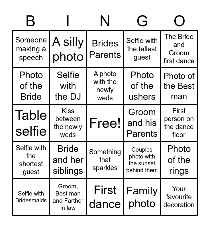This bingo card has a free space and 24 words: Selfie with Bridesmaids, Bride and her siblings, A photo with the newly weds, Family photo, The Bride and Groom first dance, Someone making a speech, A silly photo, Brides Parents, Groom and his Parents, First person on the dance floor, Table selfie, Selfie with the DJ, Couples photo with the sunset behind them, Photo of the rings, Photo of the Bride, Groom, Best man and Farther in law, First dance, Selfie with the tallest guest, Photo of the Best man, Selfie with the shortest guest, Kiss between the newly weds, Something that sparkles, Photo of the ushers and Your favourite decoration.