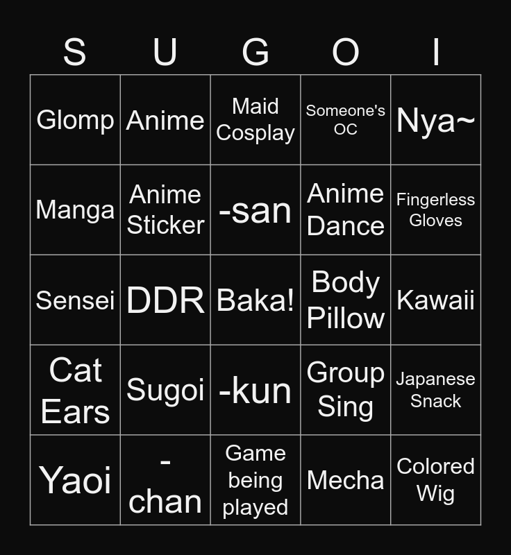 This bingo card has a free space and 24 words: Sugoi, -chan, -san, Yaoi, Nya~, Glomp, Manga, Anime, Body Pillow, -kun, Anime Dance, Sensei, Group Sing, Japanese Snack, Anime Sticker, Mecha, Kawaii, Maid Cosplay, Fingerless Gloves, DDR, Colored Wig, Cat Ears, Someone's OC and Game being played.