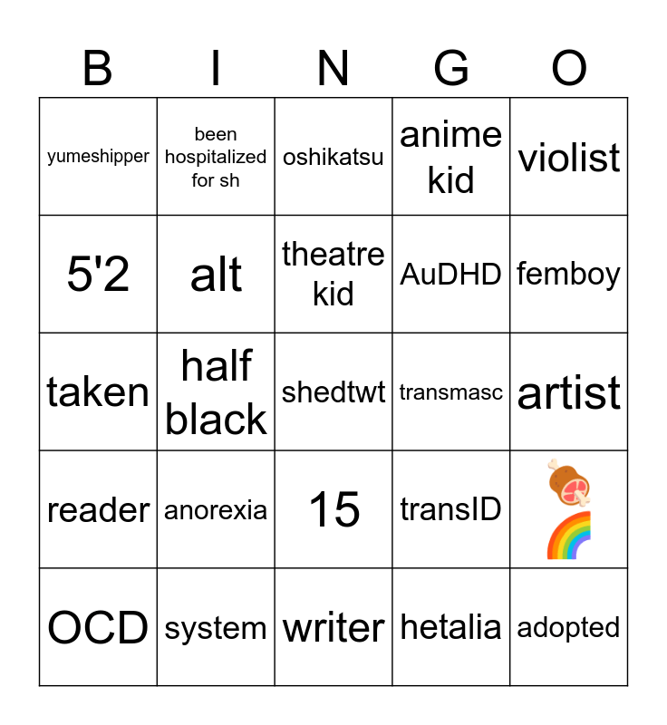 This bingo card has a free space and 24 words: anorexia, system, theatre kid, OCD, violist, yumeshipper, 5'2, been hospitalized for sh, transmasc, 15, AuDHD, taken, transID, 🍖🌈, alt, hetalia, artist, oshikatsu, femboy, half black, adopted, reader, anime kid and writer.