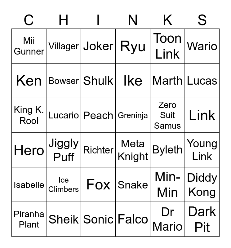 Waterboy's Elite Smash Bingo | Character Bingo | Character Bingo | Smash Bros. Bingos | Character Bingo
