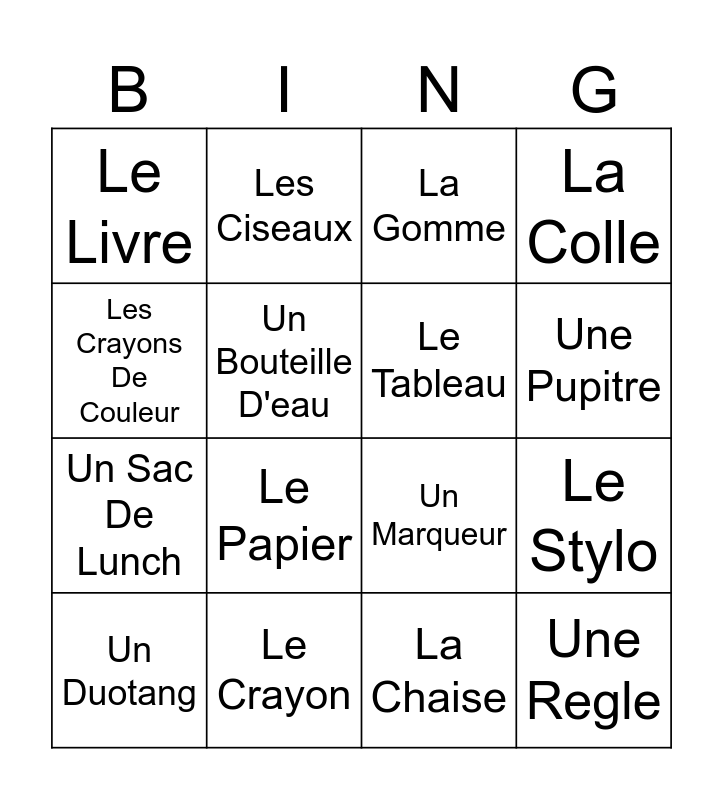 This bingo card has 16 words: Le Crayon, Le Stylo, La Gomme, Le Livre, Un Sac De Lunch, Les Ciseaux, Un Marqueur, La Chaise, Les Crayons De Couleur, Un Bouteille D'eau, Un Duotang, La Colle, Le Papier, Une Pupitre, Le Tableau and Une Regle.