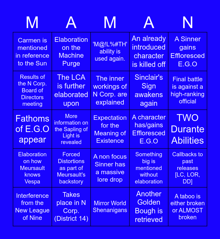 This bingo card has a free space and 24 words: Forced Distortions as part of Meursault's backstory, Takes place in N Corp. (District 14), The inner workings of N Corp. are explained, Interference from the New League of Nine, A Sinner gains Effloresced E.G.O, Carmen is mentioned in reference to the Sun, Results of the N Corp. Board of Directors meeting, Elaboration on the Machine Purge, A character has/gains Effloresced E.G.O, A non focus Sinner has a massive lore drop, Sinclair's Sign awakens again, Fathoms of E.G.O appear, Something big is mentioned without elaboration, Callbacks to past releases [LC, LOR, DD], The LCA is further elaborated upon, Another Golden Bough is retrieved, TWO Durante Abilities, 'M@!L%#TH' ability is used again., Final battle is against a high-ranking official, More information on the Sapling of Light is revealed, A taboo is either broken or ALMOST broken, Elaboration on how Meursault knows Vespa, An already introduced character is killed off and Mirror World Shenanigans.