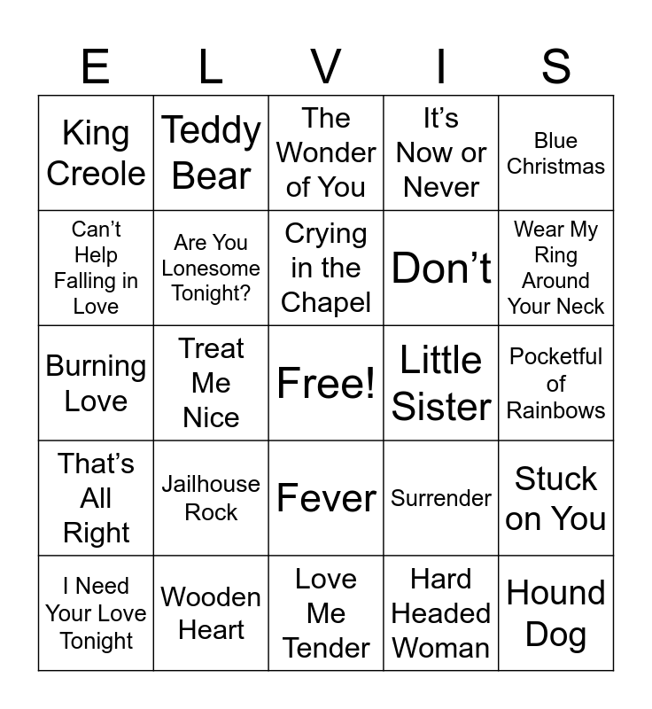 This bingo card has a free space and 47 words: Heartbreak Hotel, Hound Dog, Don’t Be Cruel, Love Me Tender, Jailhouse Rock, All Shook Up, Teddy Bear, Blue Suede Shoes, Can’t Help Falling in Love, Return to Sender, Are You Lonesome Tonight?, It’s Now or Never, Stuck on You, Surrender, Good Luck Charm, Devil in Disguise, Crying in the Chapel, Little Sister, Viva Las Vegas, Blue Christmas, Treat Me Nice, Hard Headed Woman, King Creole, Don’t, Loving You, Wear My Ring Around Your Neck, I Need Your Love Tonight, Such a Night, Fever, That’s All Right, Mystery Train, Love Me, One Night, A Big Hunk o’ Love, I Want You, I Need You, I Love You, Wooden Heart, Pocketful of Rainbows, Follow That Dream, Bossa Nova Baby, Suspicious Minds, In the Ghetto, The Wonder of You, Burning Love, Memories, If I Can Dream, Moody Blue and Kentucky Rain.