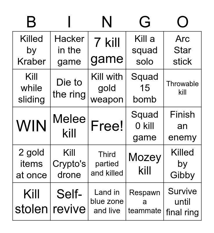This bingo card has a free space and 24 words: Kill Crypto's drone, Self-revive, Kill with gold weapon, Kill stolen, Arc Star stick, Killed by Kraber, Kill while sliding, Hacker in the game, Squad 0 kill game, Third partied and killed, Squad 15 bomb, WIN, Mozey kill, Killed by Gibby, Die to the ring, Respawn a teammate, Finish an enemy, 7 kill game, Throwable kill, Melee kill, Survive until final ring, 2 gold items at once, Kill a squad solo and Land in blue zone and live.