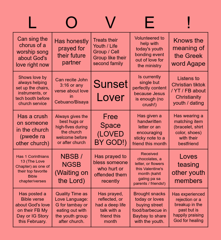 This bingo card has a free space and 24 words: NBSB / NGSB (Waiting on the Lord), Quality Time as Love Language: G for tambay or eating out with the youth group after church., Sunset Lover, Has posted a Bible verse about God's love on their FB My Day or IG Story this February., Knows the meaning of the Greek word Agape, Can sing the chorus of a worship song about God's love right now, Shows love by always helping set up the chairs, instruments, or tech booth before church service, Has honestly prayed for their future partner, Has given a handwritten letter or an encouraging sticky note to a friend this month, Has prayed to bless someone who hurt or offended them recently, Is currently single but perfectly content because Jesus is enough (no crush!), Has a crush on someone in the church (pwede ra other church), Received chocolates, a letter, or flowers this Valentine's month (kahit galing pa sa parents / friends!), Loves teasing other youth members, Can recite John 3:16 or any verse about love in Cebuano/Bisaya, Brought snacks today or loves buying street food/barbecue in Baybay to share with the youth., Has wearing a matching item (bracelet, shirt color, shoes) with their bestfriend, Treats their Youth / Life Group / Cell Group like their second family, Listens to Christian tiktok / YT / FB about Christianity youth / dating, Always gives the best hugs or high-fives during the church welcome before or after church, Has experienced rejection or a breakup in the past but is happily praising God for healing, Has 1 Corinthians 13 (The Love Chapter) as one of their top favorite Bible chapter/verses, Volunteered to help with today's youth bonding event out of love for the ministry and Has prayed, reflected, or had a deep life talk with a friend this month.
