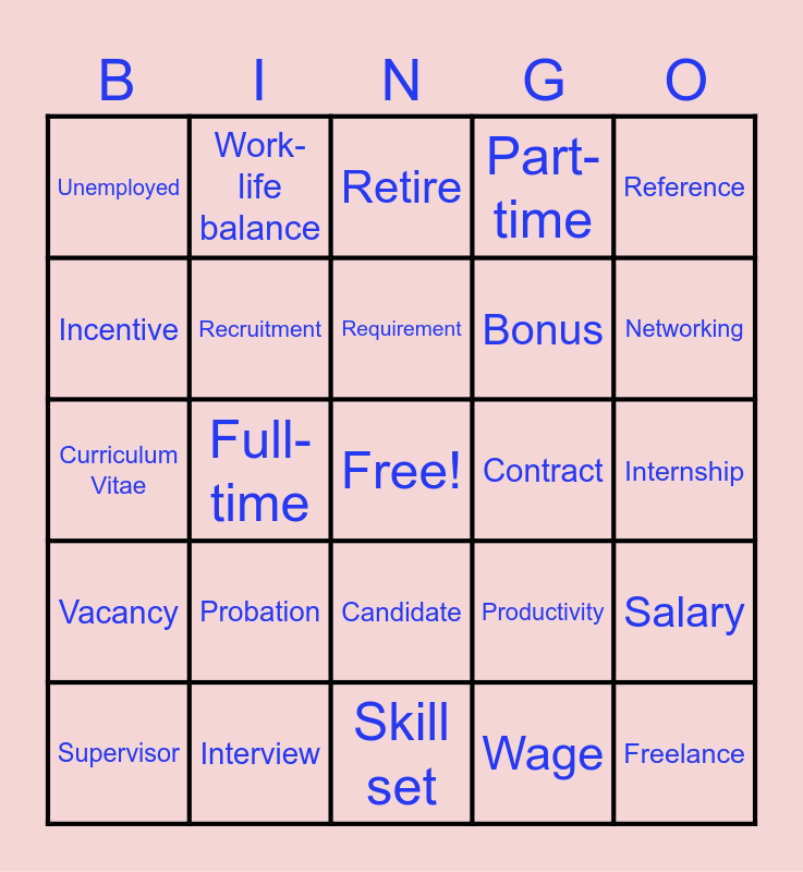 This bingo card has a free space and 40 words: Resume, Curriculum Vitae, Application, Recruitment, Interview, Candidate, Requirement, Qualification, Reference, Vacancy, Full-time, Part-time, Freelance, Internship, Contract, Probation, Permanent, Unemployed, Resign, Retire, Salary, Wage, Bonus, Incentive, Commission, Benefits, Insurance, Pension, Promotion, Overtime, Colleague, Supervisor, Deadline, Productivity, Networking, Skill set, Soft skills, Hard skills, Work-life balance and Career path.
