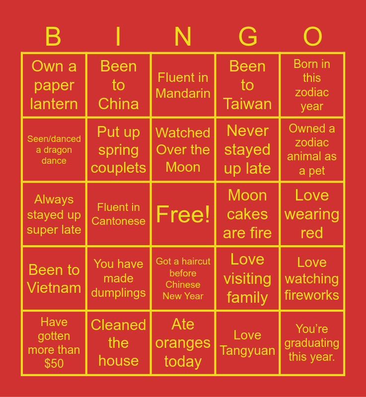 This bingo card has a free space and 24 words: You have made dumplings, Cleaned the house, Watched Over the Moon, Have gotten more than $50, Born in this zodiac year, Own a paper lantern, Seen/danced a dragon dance, Been to China, Moon cakes are fire, Got a haircut before Chinese New Year, Never stayed up late, Always stayed up super late, Love visiting family, Love watching fireworks, Put up spring couplets, Love Tangyuan, Love wearing red, Fluent in Mandarin, Owned a zodiac animal as a pet, Fluent in Cantonese, You’re graduating this year., Been to Vietnam, Been to Taiwan and Ate oranges today.
