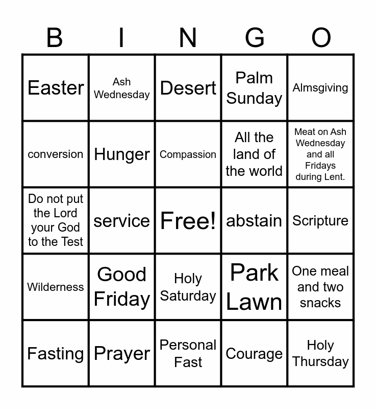 This bingo card has a free space and 24 words: Good Friday, Prayer, Compassion, Fasting, Almsgiving, Easter, conversion, Ash Wednesday, abstain, Holy Saturday, All the land of the world, Do not put the Lord your God to the Test, Park Lawn, One meal and two snacks, Hunger, Courage, Scripture, Desert, Meat on Ash Wednesday and all Fridays during Lent., service, Holy Thursday, Wilderness, Palm Sunday and Personal Fast.