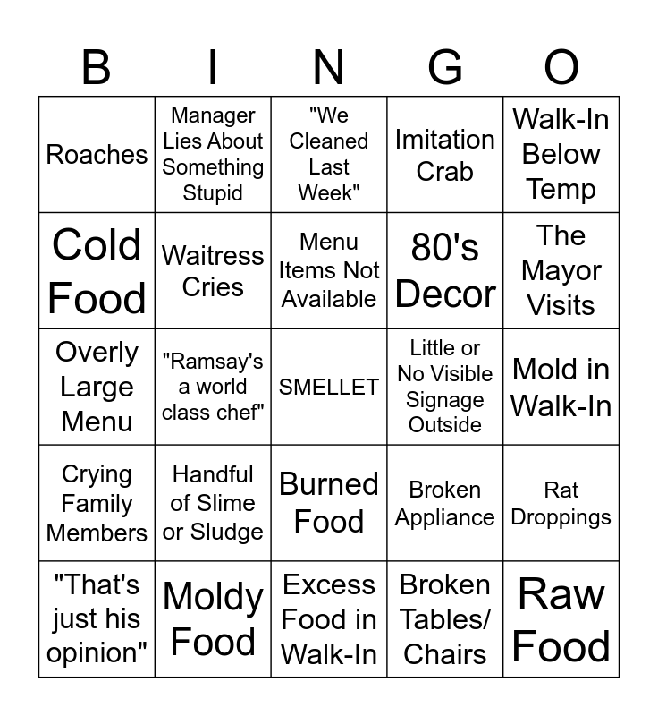 This bingo card has a free space and 24 words: Handful of Slime or Sludge, Moldy Food, Menu Items Not Available, "That's just his opinion", Walk-In Below Temp, Roaches, Cold Food, Manager Lies About Something Stupid, Little or No Visible Signage Outside, Burned Food, 80's Decor, Overly Large Menu, Broken Appliance, Rat Droppings, Waitress Cries, Broken Tables/ Chairs, Mold in Walk-In, "We Cleaned Last Week", The Mayor Visits, "Ramsay's a world class chef", Raw Food, Crying Family Members, Imitation Crab and Excess Food in Walk-In.
