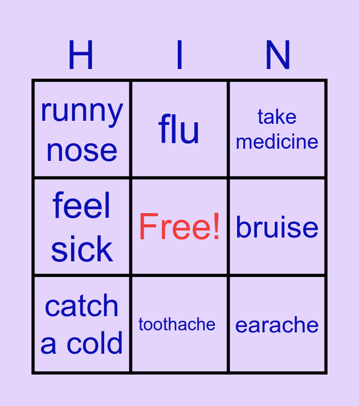 This bingo card has a free space and 8 words: bruise, take medicine, flu, catch a cold, runny nose, earache, feel sick and toothache.