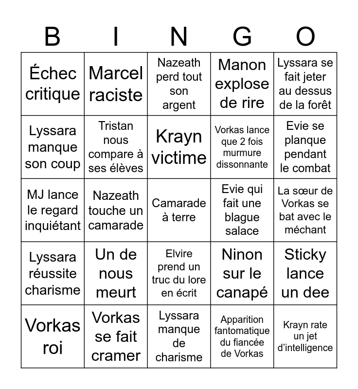 This bingo card has a free space and 24 words: Un de nous meurt, Vorkas se fait cramer, Krayn victime, Vorkas roi, Lyssara se fait jeter au dessus de la forêt, Échec critique, Lyssara manque son coup, Marcel raciste, Evie qui fait une blague salace, Elvire prend un truc du lore en écrit, Vorkas lance que 2 fois murmure dissonnante, MJ lance le regard inquiétant, Ninon sur le canapé, Sticky lance un dee, Tristan nous compare à ses élèves, Apparition fantomatique du fiancée de Vorkas, La sœur de Vorkas se bat avec le méchant, Nazeath perd tout son argent, Evie se planque pendant le combat, Nazeath touche un camarade, Krayn rate un jet d’intelligence, Lyssara réussite charisme, Manon explose de rire and Lyssara manque de charisme.