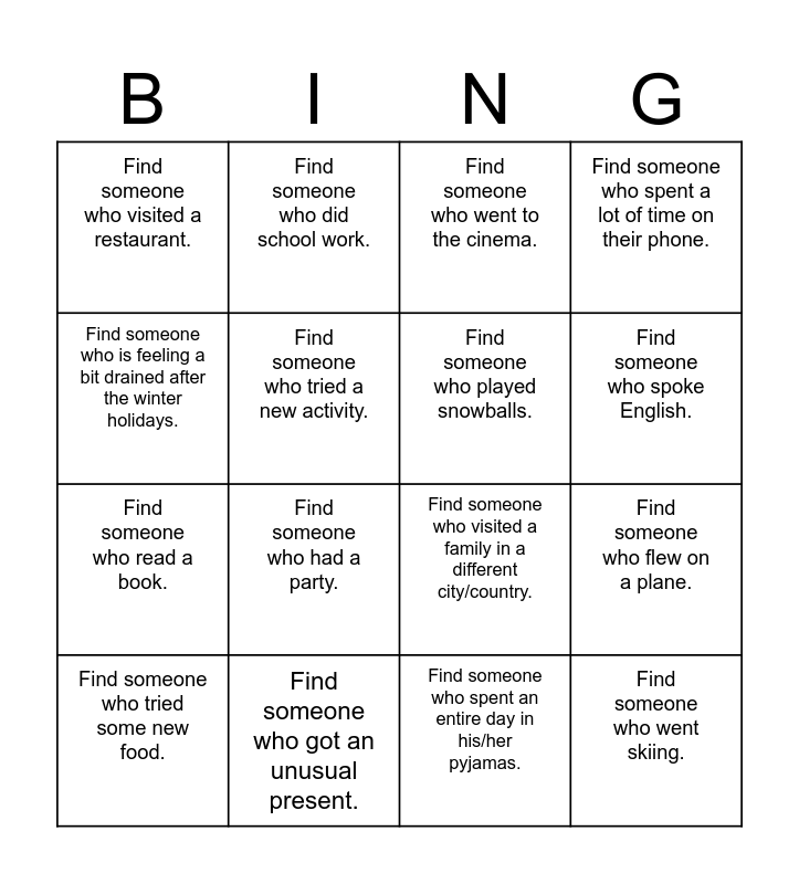 This bingo card has 18 words: Find someone who had a party., Find someone who went skiing., Find someone who went to the cinema., Find someone who visited a restaurant., Find someone who visited a family in a different city/country., Find someone who spent a lot of time on their phone., Find someone who tried some new food., Find someone who did school work., Find someone who spoke English., Find someone who read a book., Find someone who spent an entire day in his/her pyjamas., Find someone who is feeling a bit drained after the winter holidays., Find someone who flew on a plane., Find someone who tried a new activity., Find someone who played snowballs., Find someone who injured themselves., Find someone who got an unusual present. and Find someone who has already taken down all the NY decorations..