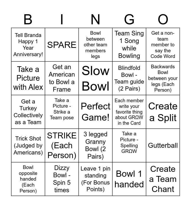 This bingo card has a free space and 24 words: STRIKE (Each Person), Dizzy Bowl - Spin 5 times, Slow Bowl, Bowl opposite handed (Each Person), Get a non-team member to say the Code Word, Tell Branda Happy 1 Year Anniversary!, Take a Picture with Alex, SPARE, Each member write your favorite thing about GRΩW in the Card, 3 legged Granny Bowl (2 Pairs), Blindfold Bowl - Team guide (2 Pairs), Get a Turkey Collectively as a Team, Take a Picture - Spelling GRΩW, Gutterball, Get an American to Bowl a Frame, Bowl 1 handed, Create a Split, Bowl between other team members legs, Backwards Bowl between your legs (Each Person), Take a Picture - Strike a Team pose, Create a Team Chant, Trick Shot (Judged by Americans), Team Sing 1 Song while Bowling and Leave 1 pin standing (For Bonus Points).