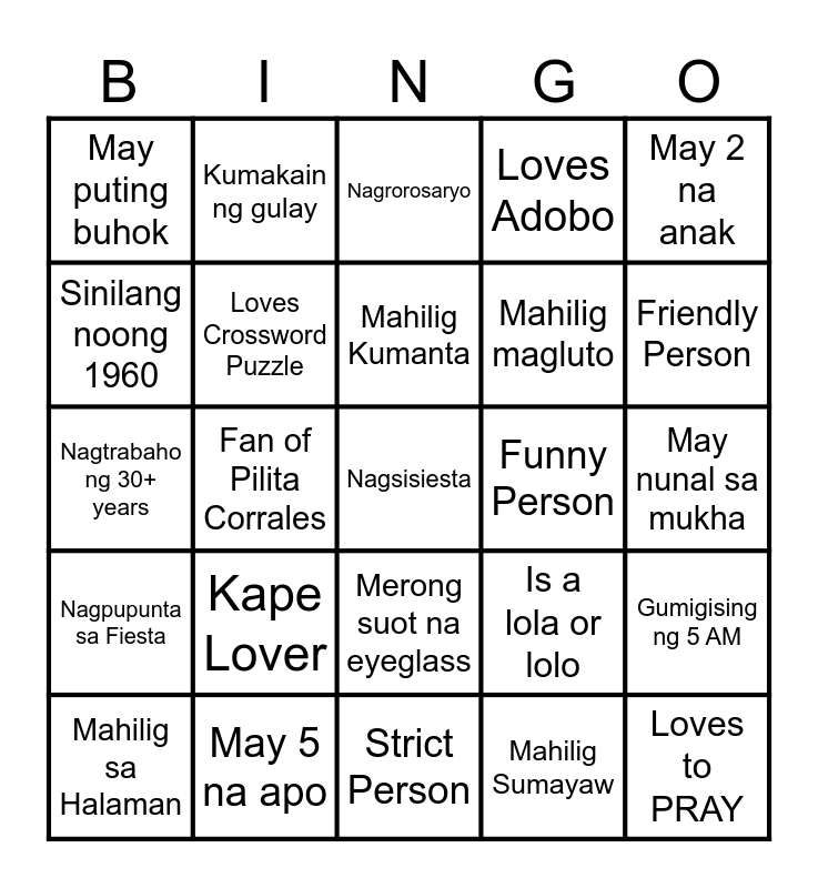 This bingo card has 26 words: Merong suot na eyeglass, Mahilig Sumayaw, Mahilig Kumanta, May 5 na apo, May 2 na anak, May puting buhok, Sinilang noong 1960, Kumakain ng gulay, May nunal sa mukha, Is a lola or lolo, Mahilig magluto, Nagtrabaho ng 30+ years, Gumigising ng 5 AM, Mahilig sa Halaman, Fan of Pilita Corrales, Mahilig sa Kakanin, Loves Adobo, Nagpupunta sa Fiesta, Nagrorosaryo, Nagsisiesta, Friendly Person, Strict Person, Funny Person, Kape Lover, Loves Crossword Puzzle and Loves to PRAY.