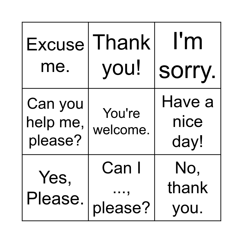 This bingo card has 9 words: Yes, Please., I'm sorry., Thank you!, Can you help me, please?, Excuse me., Have a nice day!, You're welcome., No, thank you. and Can I ..., please?.