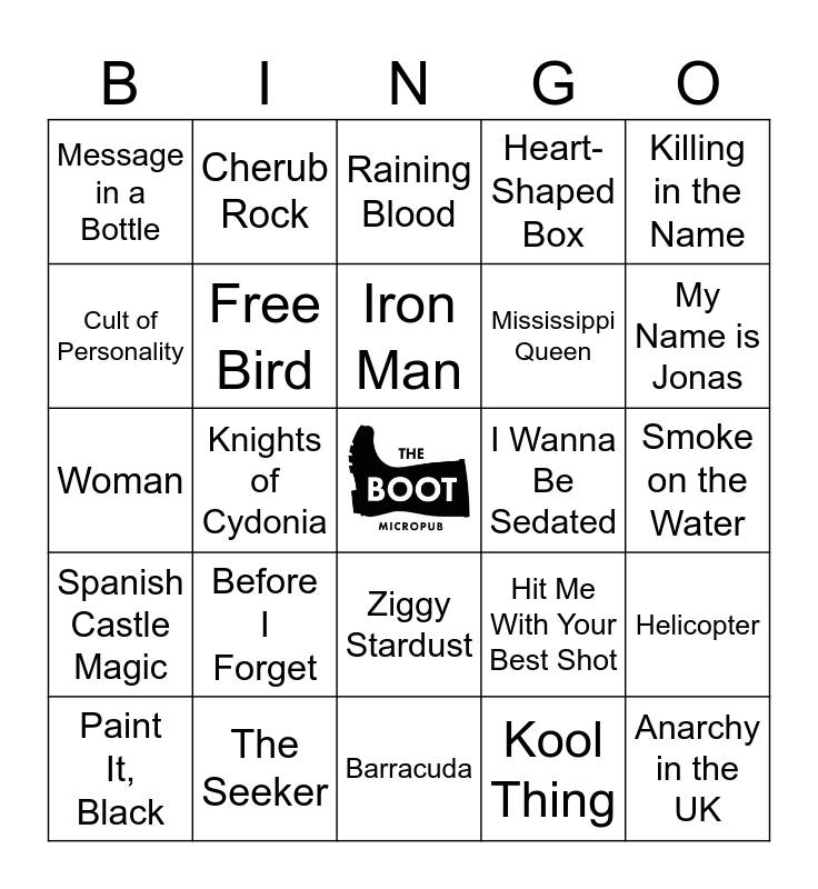 This bingo card has a free space and 51 words: Ace of Spades, Anarchy in the UK, Back in Black, Barracuda, Before I Forget, Carry On Wayward Son, Cherub Rock, Cochise, Cult of Personality, Even Flow, Free Bird, Heart-Shaped Box, Helicopter, Hit Me With Your Best Shot, Holiday in Cambodia, I Love Rock 'n Roll, Iron Man, I Wanna Be Sedated, Killer Queen, Killing in the Name, Knights of Cydonia, Kool Thing, Message in a Bottle, Mississippi Queen, Monkey Wrench, More Than A Feeling, My Name is Jonas, No One Knows, Paint It, Black, Raining Blood, Reptilia, Rock And Roll All Nite, Rock You Like A Hurricane, Sabotage, School's Out, The Seeker, Sharp Dressed Man, She Bangs the Drums, Slither, Slow Ride, Smoke on the Water, Spanish Castle Magic, Sunshine of Your Love, Sweet Child O'Mine, We're Not Gonna Take It, When You Were Young, Woman, You Really Got Me, You've Got Another Thing Coming, Ziggy Stardust and Take Me Out.
