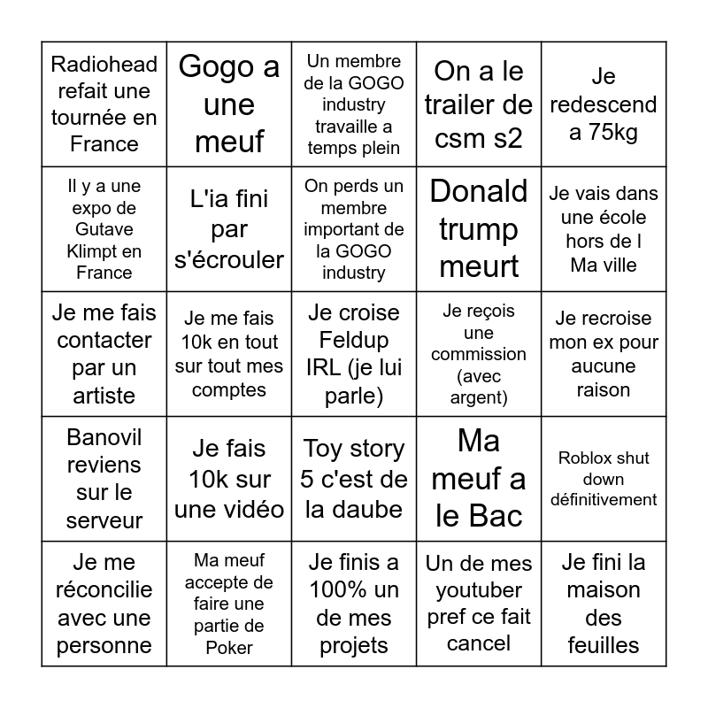 This bingo card has 25 words: Je fais 10k sur une vidéo, Je finis a 100% un de mes projets, On perds un membre important de la GOGO industry, Je me réconcilie avec une personne, Je redescend a 75kg, Radiohead refait une tournée en France, Il y a une expo de Gutave Klimpt en France, Gogo a une meuf, Je reçois une commission (avec argent), Toy story 5 c'est de la daube, Donald trump meurt, Je me fais contacter par un artiste, Ma meuf a le Bac, Roblox shut down définitivement, L'ia fini par s'écrouler, Je fini la maison des feuilles, Je recroise mon ex pour aucune raison, Un membre de la GOGO industry travaille a temps plein, Je vais dans une école hors de l Ma ville, Je me fais 10k en tout sur tout mes comptes, Je croise Feldup IRL (je lui parle), Ma meuf accepte de faire une partie de Poker, Banovil reviens sur le serveur, On a le trailer de csm s2 and Un de mes youtuber pref ce fait cancel.