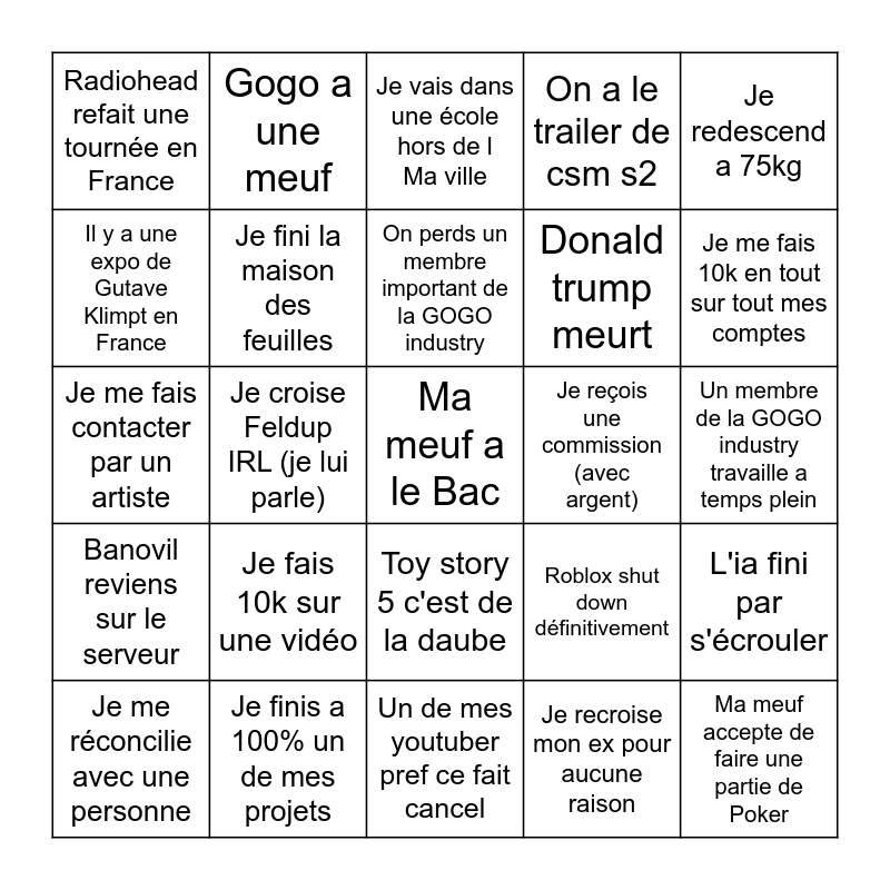 This bingo card has a free space and 24 words: Je fais 10k sur une vidéo, Je finis a 100% un de mes projets, On perds un membre important de la GOGO industry, Je me réconcilie avec une personne, Je redescend a 75kg, Radiohead refait une tournée en France, Il y a une expo de Gutave Klimpt en France, Gogo a une meuf, Je reçois une commission (avec argent), Toy story 5 c'est de la daube, Donald trump meurt, Je me fais contacter par un artiste, Roblox shut down définitivement, L'ia fini par s'écrouler, Je fini la maison des feuilles, Je recroise mon ex pour aucune raison, Un membre de la GOGO industry travaille a temps plein, Je vais dans une école hors de l Ma ville, Je me fais 10k en tout sur tout mes comptes, Je croise Feldup IRL (je lui parle), Ma meuf accepte de faire une partie de Poker, Banovil reviens sur le serveur, On a le trailer de csm s2 and Un de mes youtuber pref ce fait cancel.