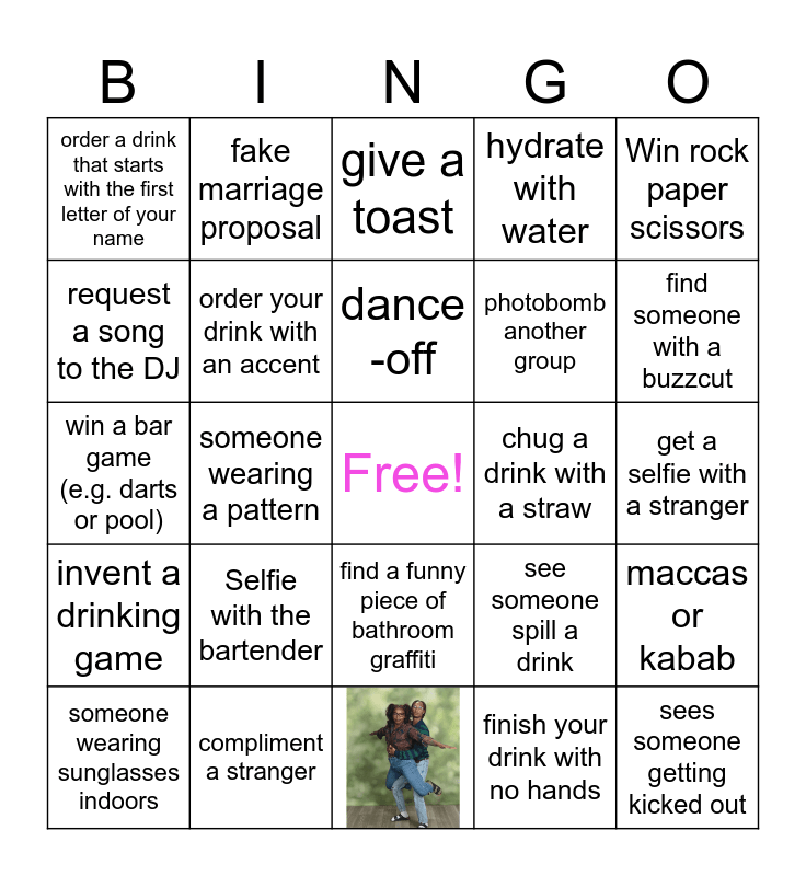 This bingo card has 1 images, a free space and 23 words: Selfie with the bartender, compliment a stranger, dance -off, someone wearing sunglasses indoors, Win rock paper scissors, order a drink that starts with the first letter of your name, request a song to the DJ, fake marriage proposal, chug a drink with a straw, find a funny piece of bathroom graffiti, photobomb another group, win a bar game (e.g. darts or pool), see someone spill a drink, maccas or kabab, order your drink with an accent, finish your drink with no hands, get a selfie with a stranger, give a toast, find someone with a buzzcut, someone wearing a pattern, sees someone getting kicked out, invent a drinking game and hydrate with water.