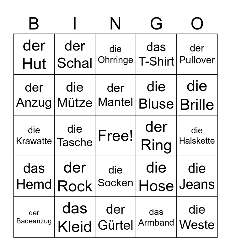 This bingo card has a free space and 25 words: der Rock, der Gürtel, der Mantel, der Badeanzug, der Pullover, der Hut, der Anzug, der Schal, der Ring, die Socken, die Bluse, die Krawatte, die Hose, die Jeans, die Mütze, die Schuhe, die Halskette, die Ohrringe, die Brille, die Tasche, die Weste, das Kleid, das Hemd, das T-Shirt and das Armband.