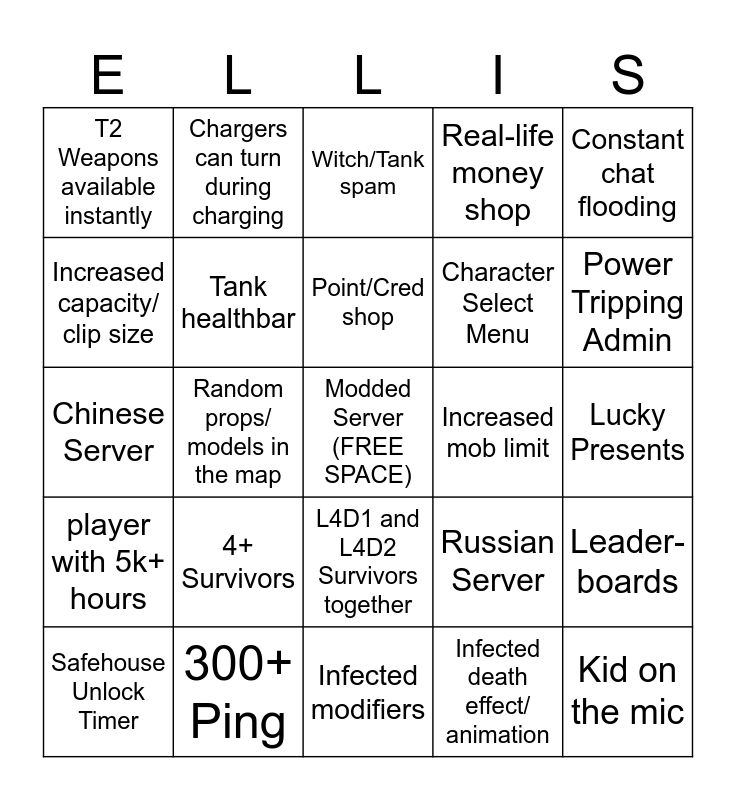 This bingo card has a free space and 24 words: 4+ Survivors, 300+ Ping, Point/Cred shop, Safehouse Unlock Timer, Constant chat flooding, T2 Weapons available instantly, Increased capacity/ clip size, Chargers can turn during charging, Increased mob limit, L4D1 and L4D2 Survivors together, Character Select Menu, Chinese Server, Russian Server, Leader-boards, Tank healthbar, Infected death effect/ animation, Lucky Presents, Witch/Tank spam, Power Tripping Admin, Random props/ models in the map, Kid on the mic, player with 5k+ hours, Real-life money shop and Infected modifiers.