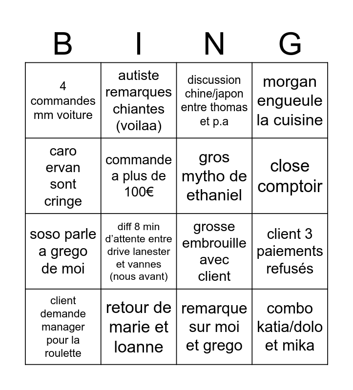 This bingo card has 16 words: retour de marie et loanne, client 3 paiements refusés, discussion chine/japon entre thomas et p.a, 4 commandes mm voiture, soso parle a grego de moi, autiste remarques chiantes (voilaa), grosse embrouille avec client, remarque sur moi et grego, caro ervan sont cringe, commande a plus de 100€, client demande manager pour la roulette, morgan engueule la cuisine, diff 8 min d’attente entre drive lanester et vannes (nous avant), close comptoir, gros mytho de ethaniel and combo katia/dolo et mika.