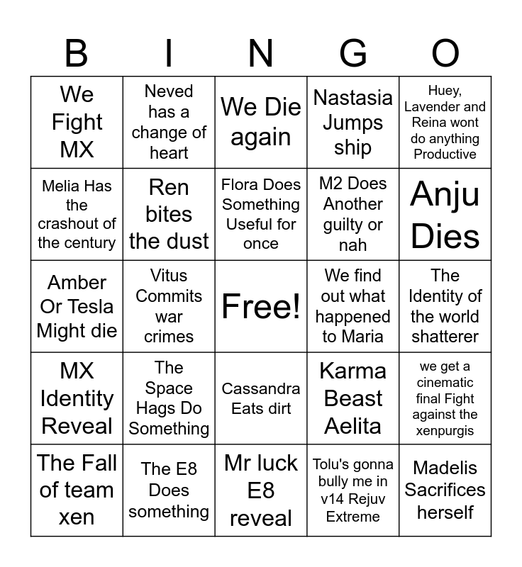 This bingo card has a free space and 24 words: The Space Hags Do Something, The E8 Does something, Flora Does Something Useful for once, The Fall of team xen, Huey, Lavender and Reina wont do anything Productive, We Fight MX, Melia Has the crashout of the century, Neved has a change of heart, We find out what happened to Maria, Cassandra Eats dirt, M2 Does Another guilty or nah, Amber Or Tesla Might die, Karma Beast Aelita, we get a cinematic final Fight against the xenpurgis, Ren bites the dust, Tolu's gonna bully me in v14 Rejuv Extreme, The Identity of the world shatterer, We Die again, Anju Dies, Vitus Commits war crimes, Madelis Sacrifices herself, MX Identity Reveal, Nastasia Jumps ship and Mr luck E8 reveal.