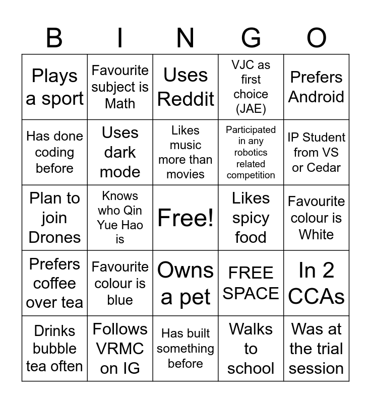This bingo card has a free space and 25 words: Favourite colour is blue, Has built something before, Likes music more than movies, Drinks bubble tea often, Prefers Android, Plays a sport, Has done coding before, Favourite subject is Math, Likes spicy food, Owns a pet, Participated in any robotics related competition, Plan to join Drones, FREE SPACE, In 2 CCAs, Uses dark mode, Watches YouTube more than Netflix, Favourite colour is White, Uses Reddit, IP Student from VS or Cedar, Knows who Qin Yue Hao is, Was at the trial session, Follows VRMC on IG, Prefers coffee over tea, VJC as first choice (JAE) and Walks to school.