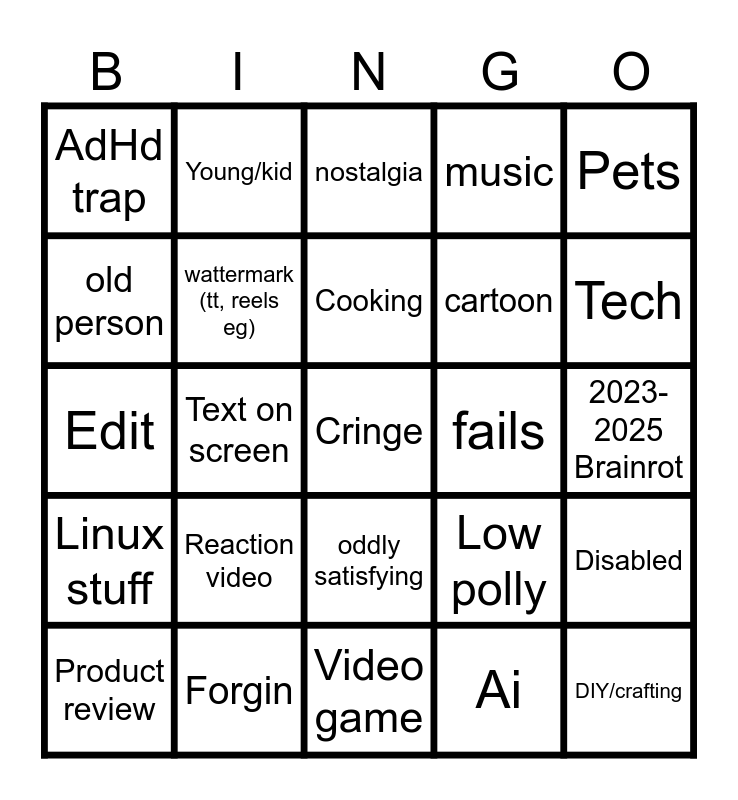 This bingo card has a free space and 24 words: Reaction video, Forgin, Cooking, Product review, Pets, AdHd trap, old person, Young/kid, fails, oddly satisfying, cartoon, Edit, Low polly, Disabled, wattermark (tt, reels eg), Ai, 2023-2025 Brainrot, nostalgia, Tech, Text on screen, DIY/crafting, Linux stuff, music and Video game.