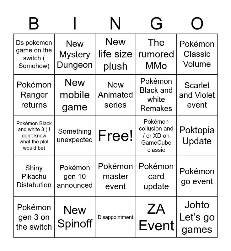 This bingo card has a free space and 24 words: Pokémon gen 10 announced, New Spinoff, New Animated series, Pokémon gen 3 on the switch, Pokémon Classic Volume, Ds pokemon game on the switch ( Somehow), Pokémon Ranger returns, New Mystery Dungeon, Pokémon collusion and / or XD on GameCube classic, Pokémon master event, Pokémon Black and white Remakes, Pokémon Black and white 3 ( I don’t know what the plot would be), Pokémon card update, Pokémon go event, New mobile game, ZA Event, Poktopia Update, New life size plush, Scarlet and Violet event, Something unexpected, Johto Let’s go games, Shiny Pikachu Distabution, The rumored MMo and Disappointment.