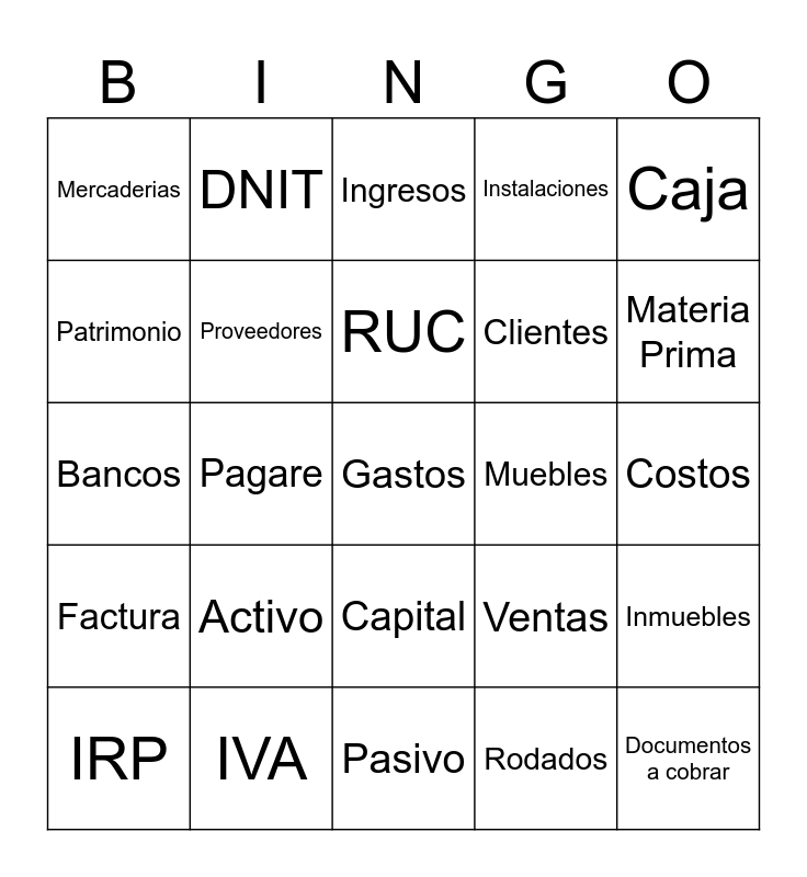 This bingo card has a free space and 24 words: Activo, IVA, RUC, IRP, Caja, Mercaderias, Patrimonio, DNIT, Muebles, Capital, Clientes, Bancos, Ventas, Inmuebles, Proveedores, Rodados, Costos, Ingresos, Materia Prima, Pagare, Documentos a cobrar, Factura, Instalaciones and Pasivo.