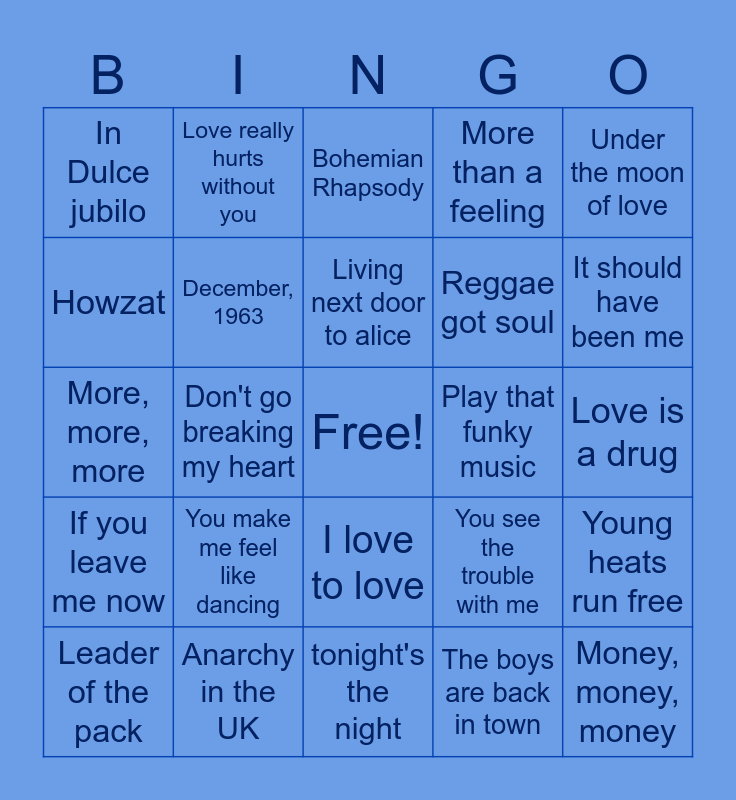 This bingo card has a free space and 32 words: The boys are back in town, Save your kisses for me, Don't go breaking my heart, Dancing queen, If you leave me now, December, 1963, Under the moon of love, Young heats run free, Love really hurts without you, Somebody to love, Living next door to alice, Bohemian Rhapsody, The combine harvester, Let's stick together, Play that funky music, You should be dancing, Leader of the pack, More, more, more, I love to love, You make me feel like dancing, You see the trouble with me, Convoy, Love is a drug, Anarchy in the UK, Money, money, money, More than a feeling, Reggae got soul, Howzat, In Dulce jubilo, tonight's the night, Arm's of Mary and It should have been me.