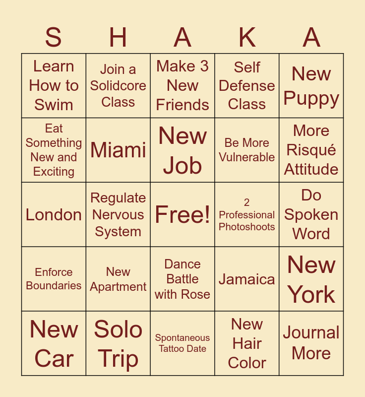 This bingo card has a free space and 24 words: New Car, New Apartment, New Job, New Hair Color, New Puppy, Learn How to Swim, Join a Solidcore Class, Make 3 New Friends, 2 Professional Photoshoots, Do Spoken Word, London, Miami, Jamaica, New York, Eat Something New and Exciting, Solo Trip, Spontaneous Tattoo Date, Self Defense Class, More Risqué Attitude, Enforce Boundaries, Regulate Nervous System, Dance Battle with Rose, Be More Vulnerable and Journal More.