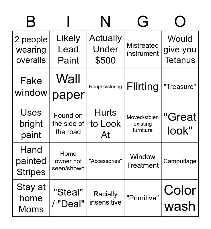 This bingo card has a free space and 34 words: "Rustic", "Primitive", Diagonal Furniture, Inappropriate adhesive, Hand painted Stripes, Wall paper, Would give you Tetanus, Stay at home Moms, Likely Lead Paint, Rug Over Carpet, Reupholstering, Actually Under $500, Piece of resistance', Crackle paint, Moved/stolen existing furniture, "Treasure", "Steal" / "Deal", Uses bright paint, Home owner not seen/shown, Window Treatment, "Accessories", Dead plants as Decoration, 2 people wearing overalls, "Great look", Racially insensitive, Color wash, Mistreated instrument, A weathered look, Flirting, Fake window, Ineffective curtain, Found on the side of the road, Camouflage and Too many patterns.