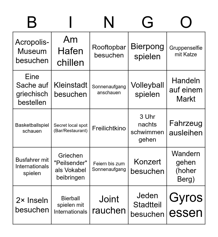 This bingo card has a free space and 24 words: Griechen "Peilsender" als Vokabel beibringen, Bierball spielen mit Internationals, Sonnenaufgang anschauen, 2× Inseln besuchen, Gruppenselfie mit Katze, Acropolis-Museum besuchen, Eine Sache auf griechisch bestellen, Am Hafen chillen, 3 Uhr nachts schwimmen gehen, Feiern bis zum Sonnenaufgang, Volleyball spielen, Basketballspiel schauen, Konzert besuchen, Wandern gehen (hoher Berg), Kleinstadt besuchen, Jeden Stadtteil besuchen, Fahrzeug ausleihen, Rooftopbar besuchen, Handeln auf einem Markt, Secret local spot (Bar/Restaurant), Gyros essen, Busfahrer mit Internationals spielen, Bierpong spielen and Joint rauchen.
