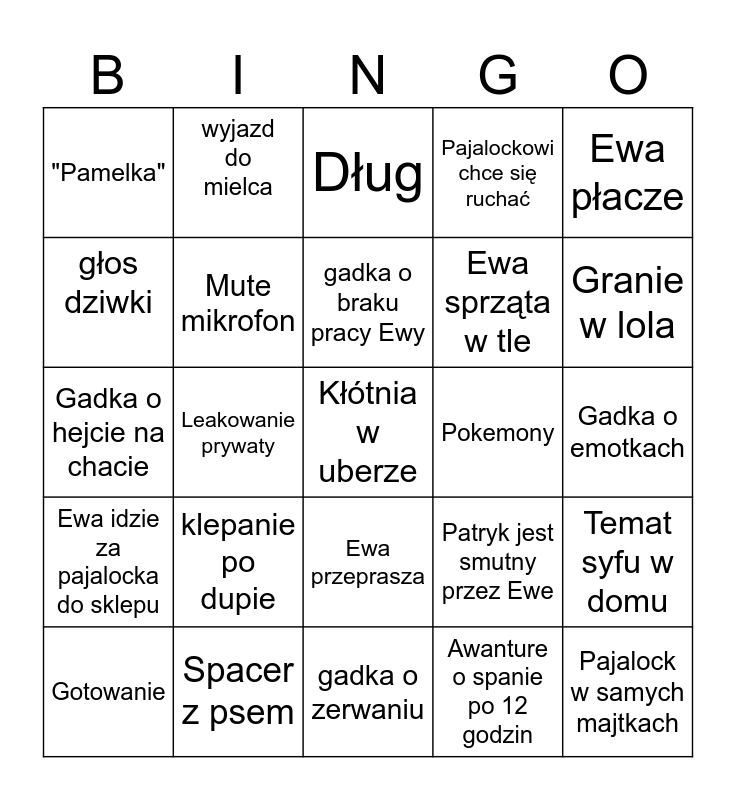 This bingo card has 25 words: klepanie po dupie, gadka o zerwaniu, gadka o braku pracy Ewy, Gotowanie, Ewa płacze, "Pamelka", głos dziwki, wyjazd do mielca, Pokemony, Ewa przeprasza, Ewa sprząta w tle, Gadka o hejcie na chacie, Patryk jest smutny przez Ewe, Temat syfu w domu, Mute mikrofon, Pajalock w samych majtkach, Gadka o emotkach, Dług, Granie w lola, Leakowanie prywaty, Kłótnia w uberze, Spacer z psem, Ewa idzie za pajalocka do sklepu, Pajalockowi chce się ruchać and Awanture o spanie po 12 godzin.