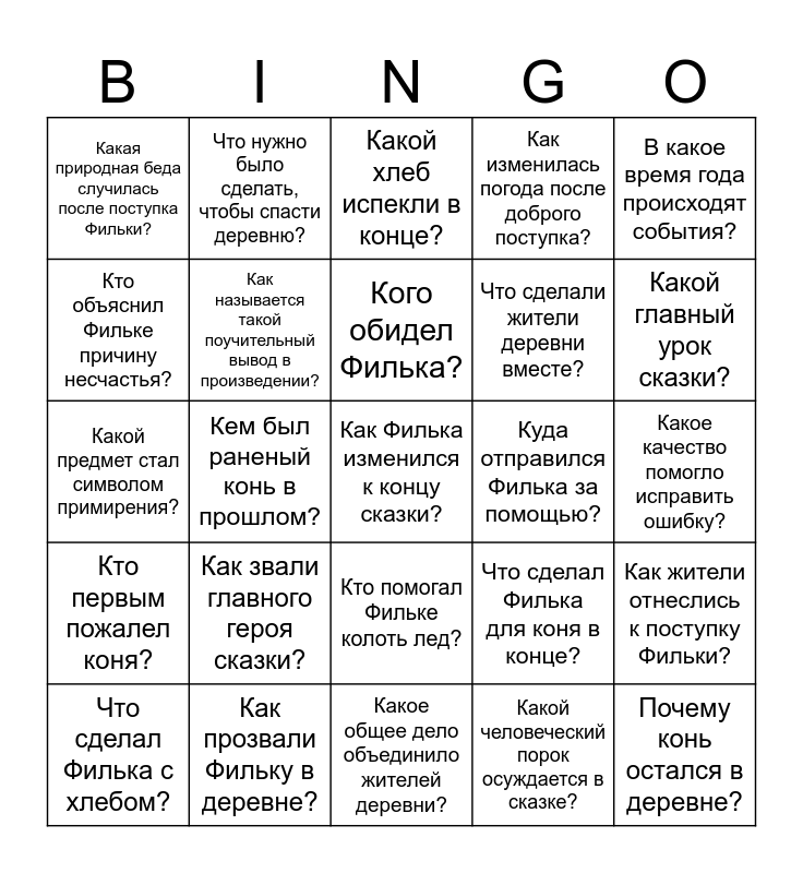 This bingo card has a free space and 24 words: Как звали главного героя сказки?, Как прозвали Фильку в деревне?, Кого обидел Филька?, Что сделал Филька с хлебом?, В какое время года происходят события?, Какая природная беда случилась после поступка Фильки?, Кто объяснил Фильке причину несчастья?, Что нужно было сделать, чтобы спасти деревню?, Куда отправился Филька за помощью?, Кто помогал Фильке колоть лед?, Что сделали жители деревни вместе?, Какой предмет стал символом примирения?, Что сделал Филька для коня в конце?, Как жители отнеслись к поступку Фильки?, Как называется такой поучительный вывод в произведении?, Какой человеческий порок осуждается в сказке?, Какое качество помогло исправить ошибку?, Какой хлеб испекли в конце?, Какой главный урок сказки?, Кем был раненый конь в прошлом?, Почему конь остался в деревне?, Кто первым пожалел коня?, Как изменилась погода после доброго поступка? and Какое общее дело объединило жителей деревни?.