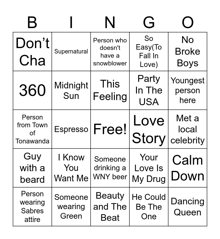 This bingo card has a free space and 48 words: It Takes Two, Dancing Queen, Now That We Found Love, Beauty and The Beat, I Know You Want Me, Love You Like A Love Song, Supernatural, Paint The Town Red, 360, Sao Paulo, Midnight Sun, So Easy(To Fall In Love), Calm Down, Your Love Is My Drug, Clarity, What Dreams Are Made Of, This Feeling, Love Story, Sucker, No Broke Boys, Espresso, He Could Be The One, Donβt Cha, Party In The USA, Went to Kenmore West with Jessica, Youngest person here, Person wearing Sabres attire, Someone drinking a Canadian beer, Someone drinking a WNY beer, Guy with a beard, Has watched Cash, Someone who was a Boy or Girl Scout, Someone wearing fun socks, Woman wearing red lipstick, Someone wearing Green, Someone with curly hair, Worked with Jess or Pete, Met a local celebrity, Has season tickets to the Bills or Sabres, Went to Buff State, Drives the same color or make of car as Jess, Person from the Southtowns or city of Buffalo, Person who doesn't have a snowblower, Person from Williamsville, Person from Town of Tonawanda, Person who is from outside of WNY, Someone wearing the same color as Jess and Someone related to Jess.