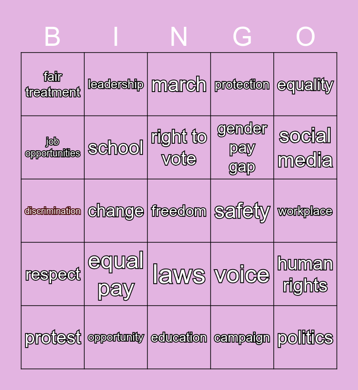 This bingo card has 25 words: equal pay, education, right to vote, protest, equality, fair treatment, job opportunities, leadership, safety, laws, gender pay gap, discrimination, voice, human rights, school, politics, workplace, march, social media, change, freedom, opportunity, respect, protection and campaign.