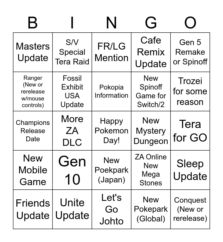 This bingo card has a free space and 24 words: Gen 10, Unite Update, Pokopia Information, Friends Update, Gen 5 Remake or Spinoff, Masters Update, Ranger (New or rerelease w/mouse controls), S/V Special Tera Raid, New Mystery Dungeon, New Poekpark (Japan), New Spinoff Game for Switch/2, Champions Release Date, ZA Online New Mega Stones, Sleep Update, Fossil Exhibit USA Update, New Pokepark (Global), Tera for GO, FR/LG Mention, Trozei for some reason, More ZA DLC, Conquest (New or rerelease), New Mobile Game, Cafe Remix Update and Let's Go Johto.